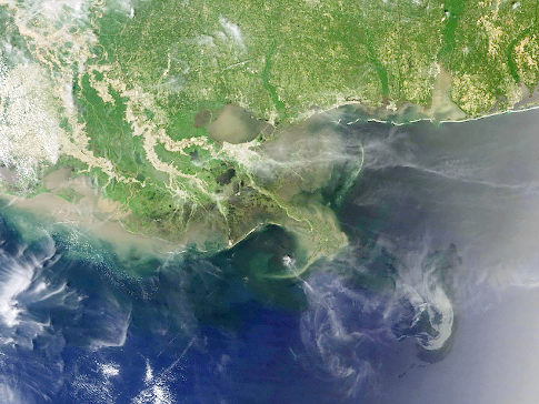 This image from the Moderate Resolution Imaging Spectroradiometer (MODIS) on NASA’s Aqua satellite on May 10, 2010 and released by NASA on May 17, shows the oil spill which has remained in the Gulf of Mexico not far from the Mississippi Delta. Thin, wispy clouds partially obscure the satellite sensor’s view of the ocean surface south of the Mississippi Delta, but oil on the water’s surface is still apparent southeast of the delta. The most obvious portion of the gray-beige slick arches toward the west, with inward-curling tendrils. REUTERS/NASA/ MODIS Rapid Response Team/Handout (UNITED STATES – Tags: DISASTER ENVIRONMENT) FOR EDITORIAL USE ONLY. NOT FOR SALE FOR MARKETING OR ADVERTISING CAMPAIGNS Original Filename: 2010-05-17T194027Z_01_LOA02_RTRMDNP_3_OIL-RIG-LEAK.JPG